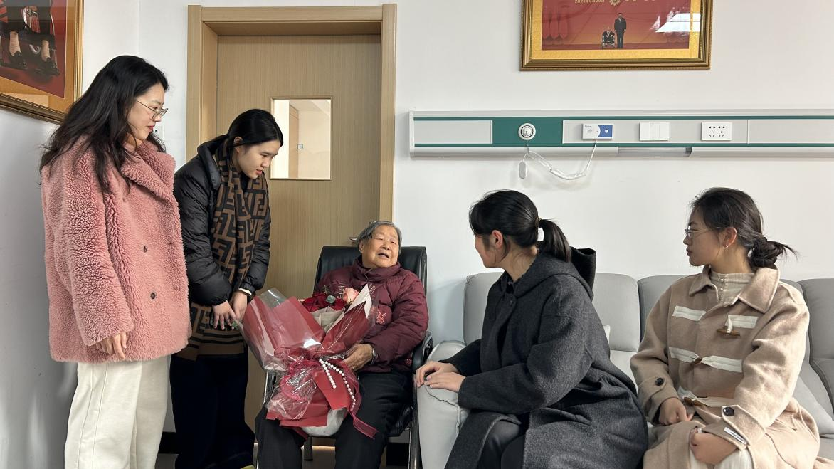 解兆丹老师带领学生前往安徽省合肥市,看望渡江战役中的一等渡江功臣、七一勋章获得者马毛姐。