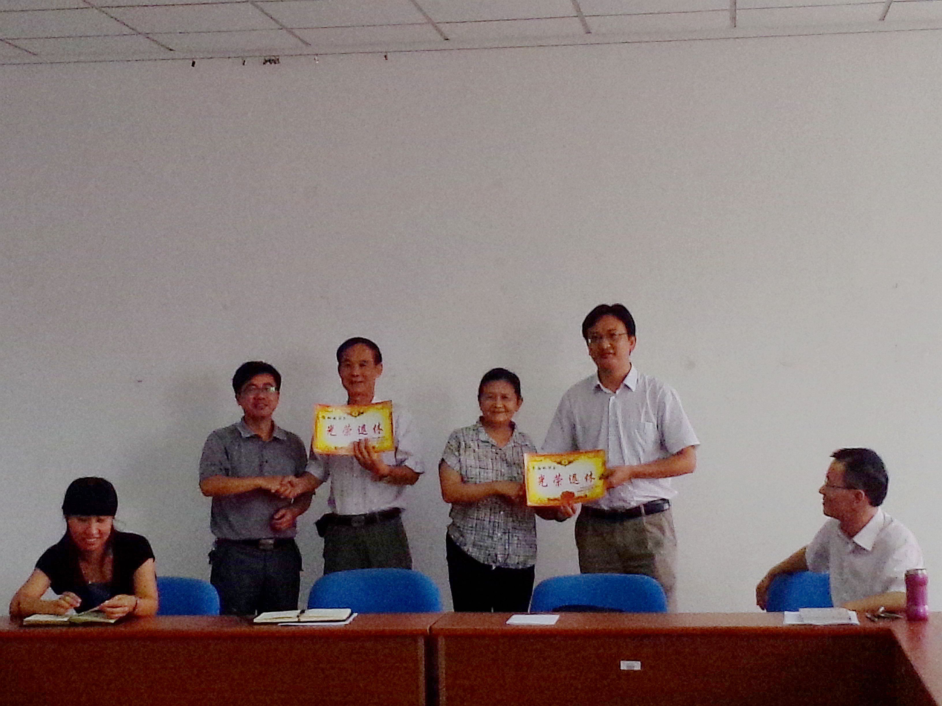 领导向谢树放教授、李国环副教授颁发“光荣退休证”