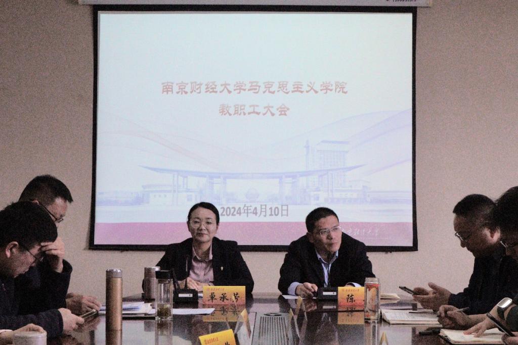 在德正楼508会议室召开全院教职工大会,院党委书记陈翔、院长卓承芳、副院长刘希刚、副院长王敏光、院长助理范渊凯及全体教师参加会议。会议由陈翔书记主持。