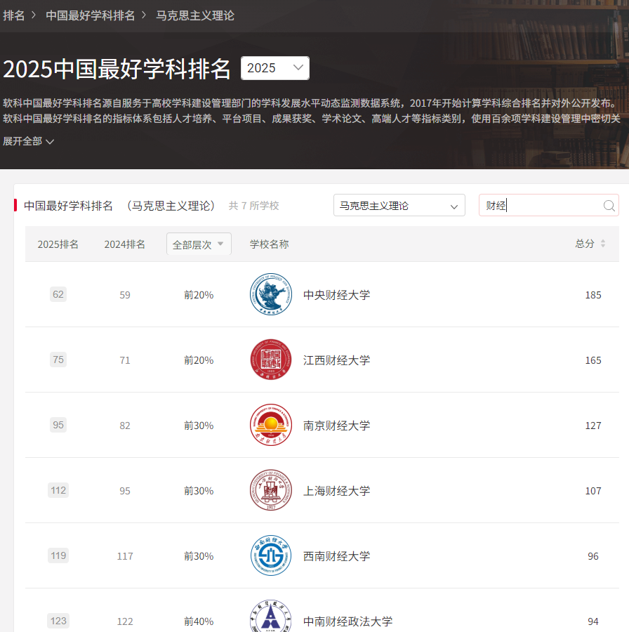 近日,高等教育评价专业机构软科发布“2025软科中国最好学科排名”。在《2025年软科中国最好学科排名》中,南京财经大学马克思主义理论学科等级为B(全国前30%),在全国高校中排名第95,在全国财经类高校中排名第4。