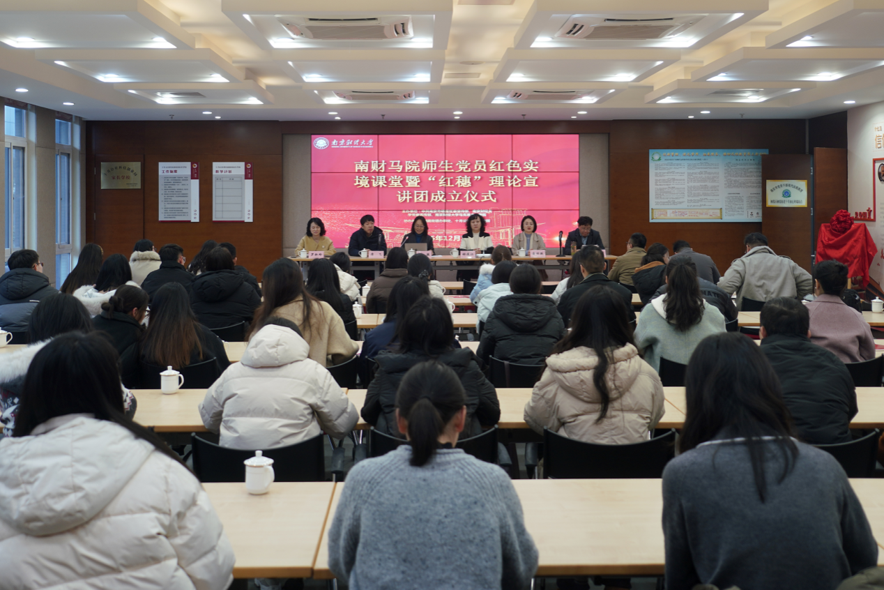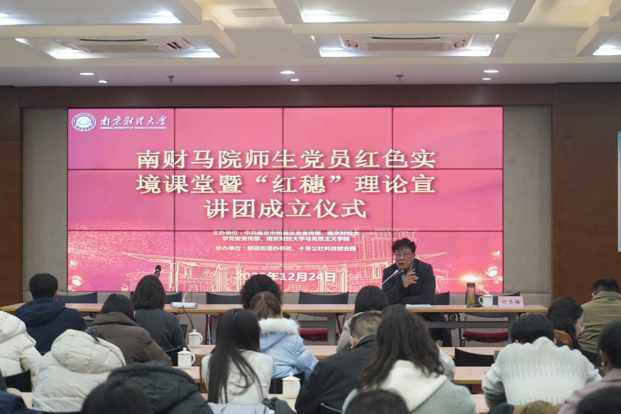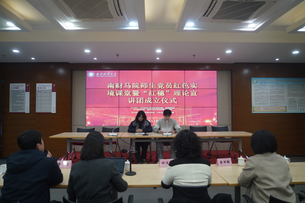 党委书记李骏宣布宣讲团正式成立,栖霞区委宣传部常务副部长钟漫江、南京财经大学党委宣传部副部长(挂)席飞共同为宣讲团揭牌。