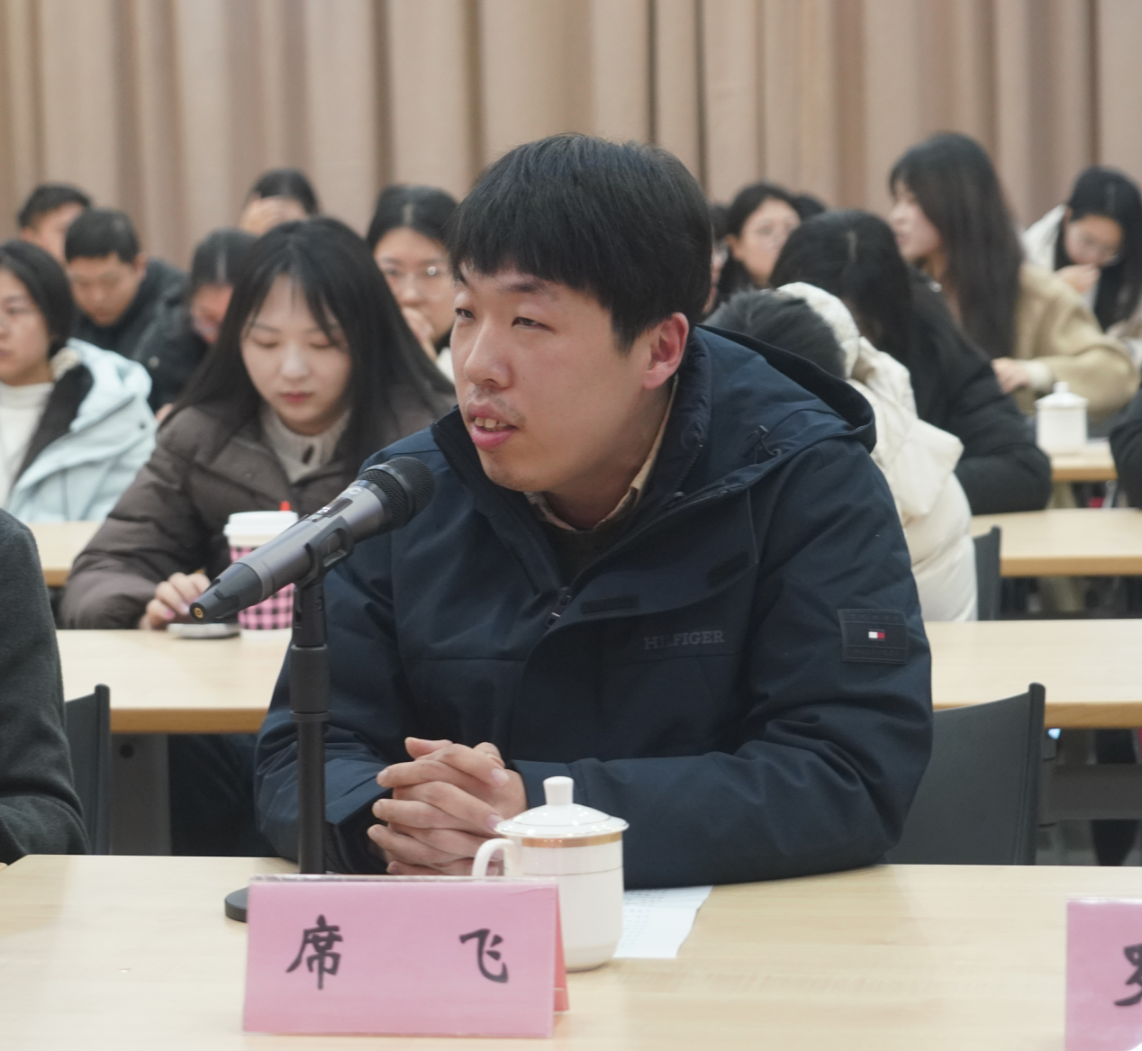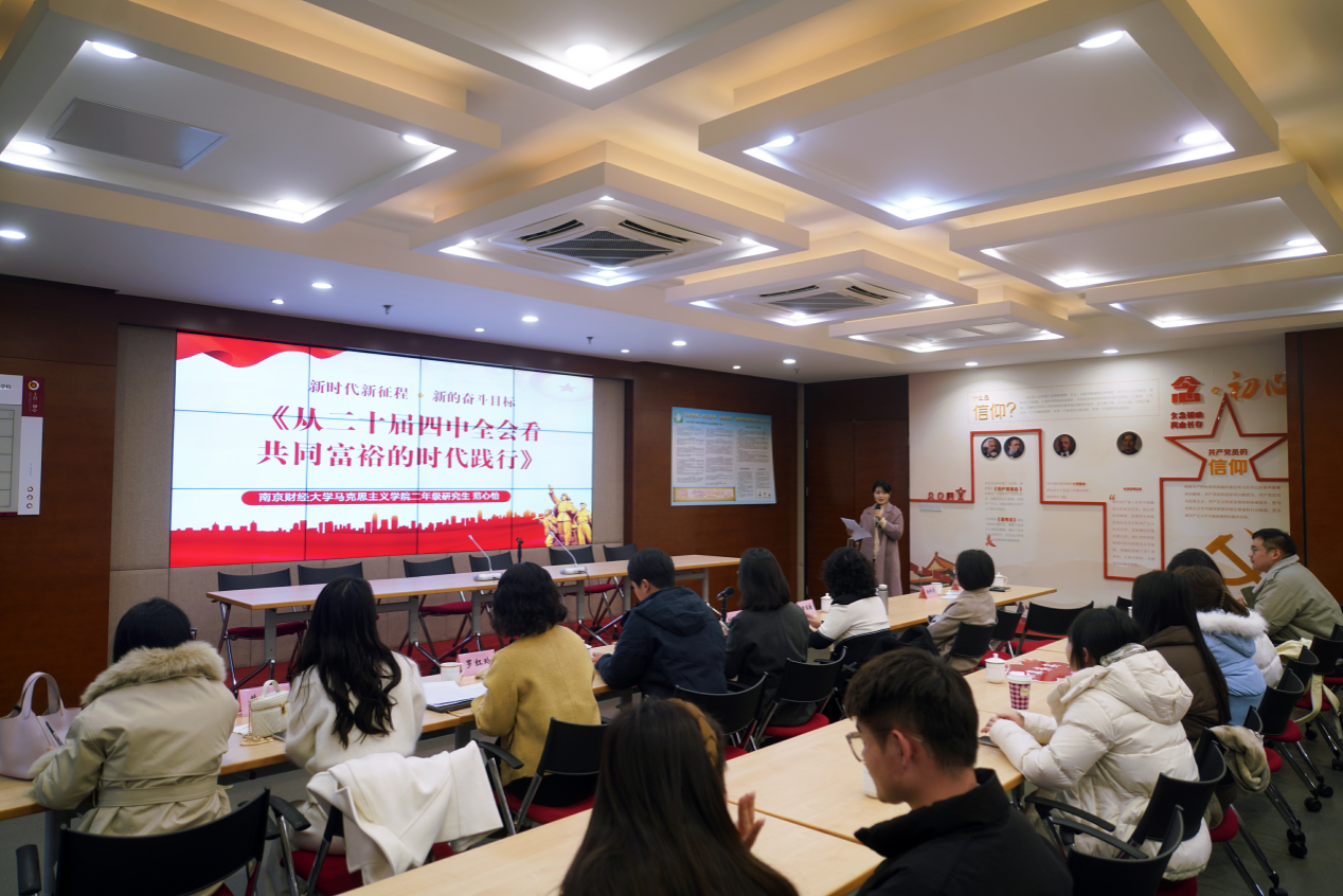 南财马院学生代表朱传仿、王军结合讲解分享学习感悟,教师党员李飞现场点评补充,让在场人员深刻领会到这一思想的历史根基与现实价值,也为后续理论宣讲筑牢了实践基础。