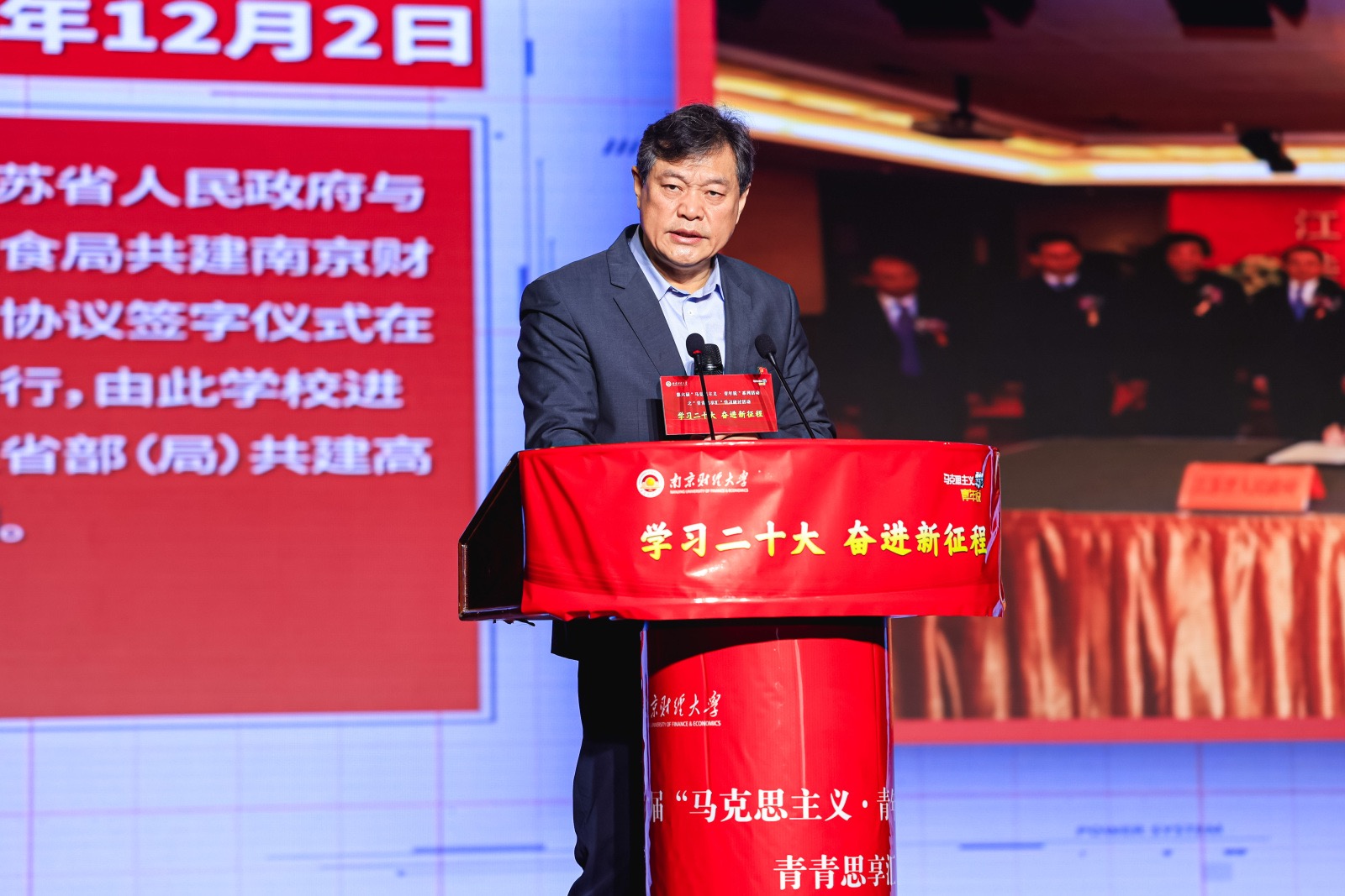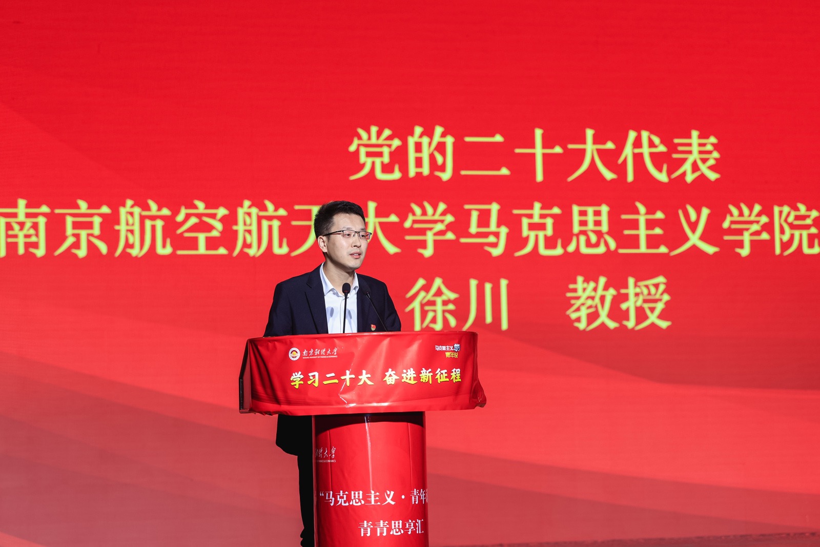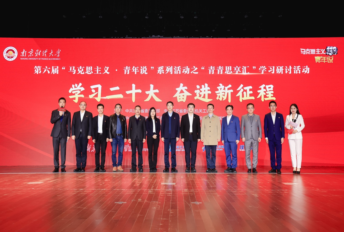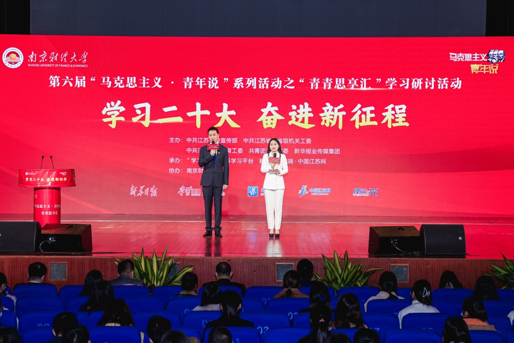 1118日上午,以学习二十大,奋进新征程为主题的第六届“马克思主义•青年说”系列活动之青春思想汇学习研讨活动在我校大学生活动中心成功举办。省纪委监委驻省委宣传部纪检监察组组长黄华,省委教育工委副书记、省教育厅党组成员徐子敏,新华日报社党委委员、副总编辑、中国江苏网董事长、总编辑陆峰,我校党委副书记(正校级)温潘亚教授,省教育厅社政处处长赵玉蓉,副处长邹燕、薄其芳,共青团江苏省委高校部部长付建龙,省委宣传部理论处副处长李向阳,南京大学21点app 院长胡大平教授、南京航空航天大学21点app 党委书记徐川教授、副院长何畏教授,中国矿业大学21点app 院长亓光教授,江南大学21点app 唐忠宝教授,南京大学21点app 院长助理张明副教授,南京师范大学21点app 王磊副教授,我校党校办、党委宣传部、校团委和21点app 等单位负责人出席活动,21点app 全体师生参加此次活动。本次活动由中共江苏省委宣传部、中共江苏省委省级机关工委、中共江苏省委教育工委、共青团江苏省委和新华报业传媒集团共同主办,学习强国江苏学习平台、新江苏客户端中国江苏网承办,南京财经大学协办。