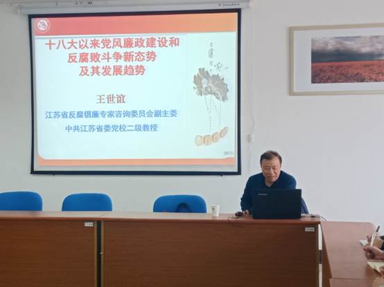 作了一场题为“十八大以来党风廉政建设和反腐败斗争的新态势及其发展趋势”的主题讲座。讲座由耿步健教授主持,全体研究生参加此次讲座。