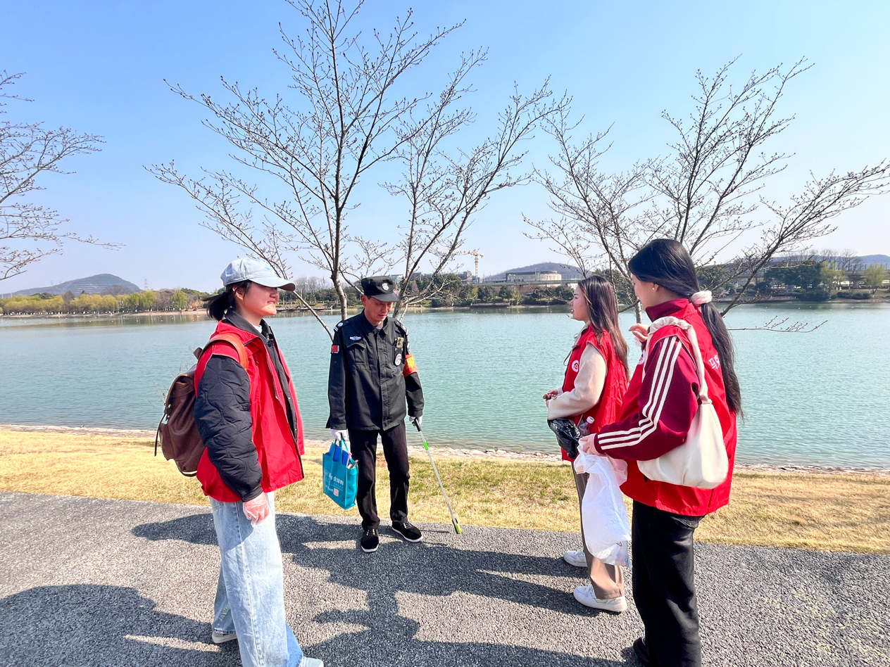 活动中,同学们手持垃圾夹和环保袋,沿环湖步道进行清洁工作。大家不仅细心捡拾隐藏在草丛中的食品包装、石缝里的烟头以及长椅下的果皮,还积极协助公园管理人员工作。